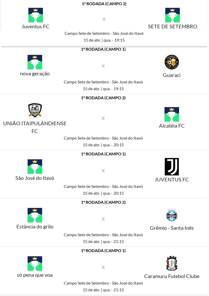 A sequência do campeonato está marcada para quarta-feira, dia 15 de abril, no Campo Mariano Pires, em São José do Itavó, com a estreia das equipes da categoria idade livre e também da categoria 40+. A mudança, inicialmente prevista para terça-feira, dia 14 de abril, ocorreu devido à agenda da equipe de Itaipulândia Futsal junto à federação.