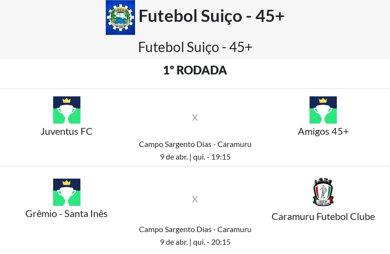A Secretaria de Cultura e Esportes anunciou as datas da primeira rodada do futebol suÃço. A competição terá inÃcio na quinta-feira, dia 9 de abril, no Campo Sargento Dias, no Caramuru, com a estreia das equipes da categoria 45+.