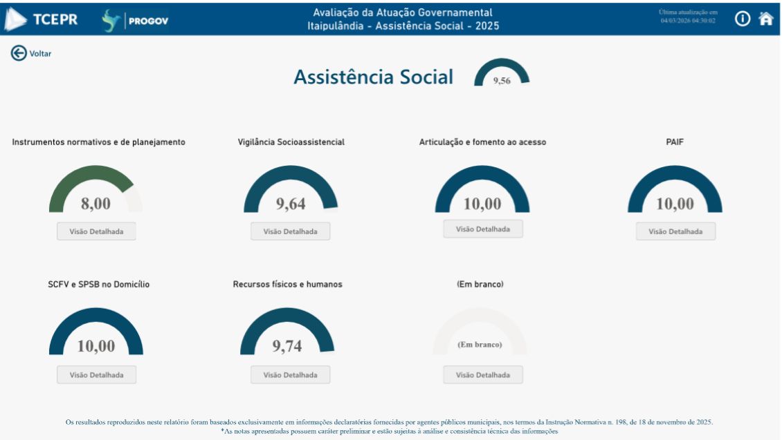 A política pública de Assistência Social de Itaipulândia obteve média 9,56 na avaliação realizada pelo Tribunal de Contas do Estado do Paraná (TCE-PR), referente ao exercício de 2025. O índice foi alcançado no questionário aplicado pelo órgão de controle, que analisa a atuação governamental e a prestação de contas das gestões municipais.