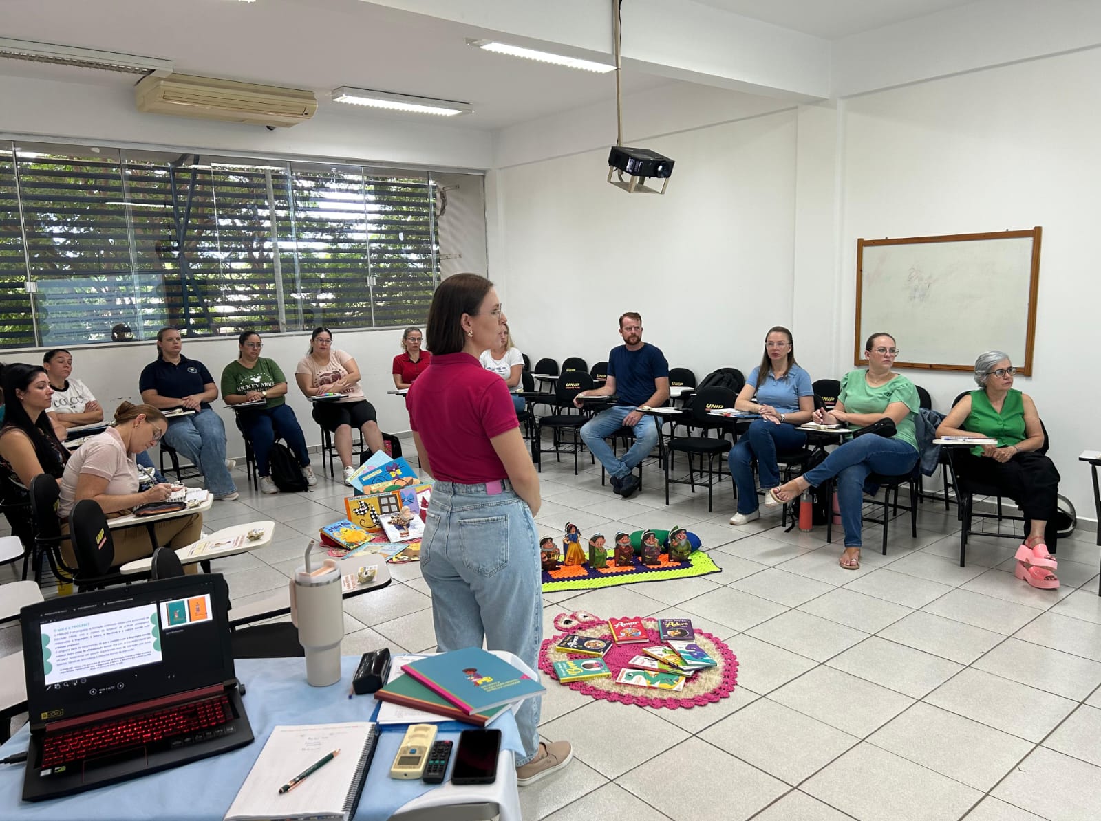 A formação foi conduzida pela formadora municipal do PROLEEI, que também atua como assessora da Educação Infantil (0 a 3 anos) e teve como foco a apresentação dos objetivos do programa, bem como o início das reflexões sobre a prática docente na Educação Infantil e o papel do professor na mediação das experiências das crianças com a linguagem, a leitura, a literatura e a cultura escrita.