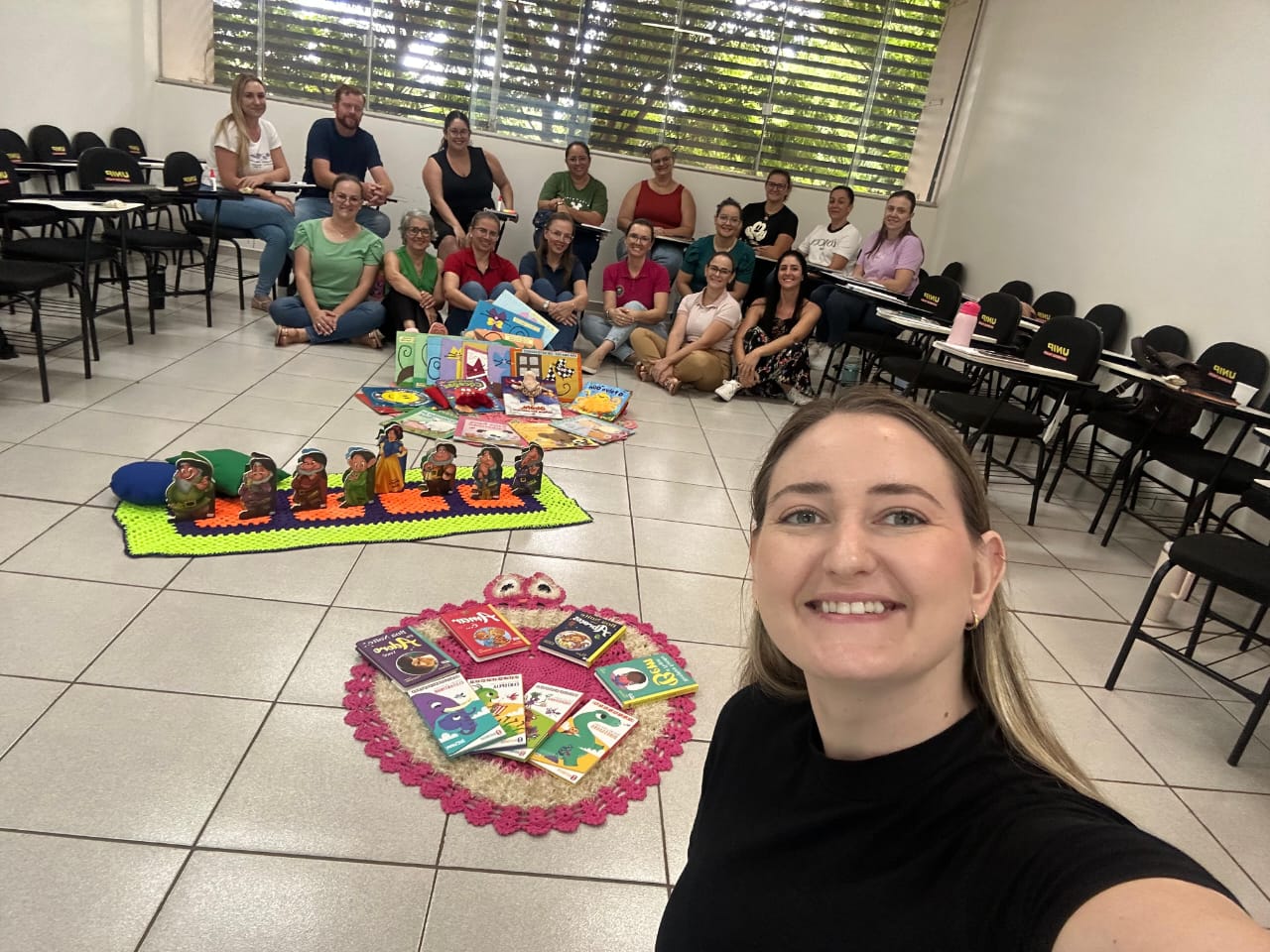 Durante o encontro, as professoras também participaram de momentos de reflexão sobre suas trajetórias pessoais e profissionais, discutindo concepções de infância, docência e as especificidades do trabalho pedagógico com crianças pequenas.