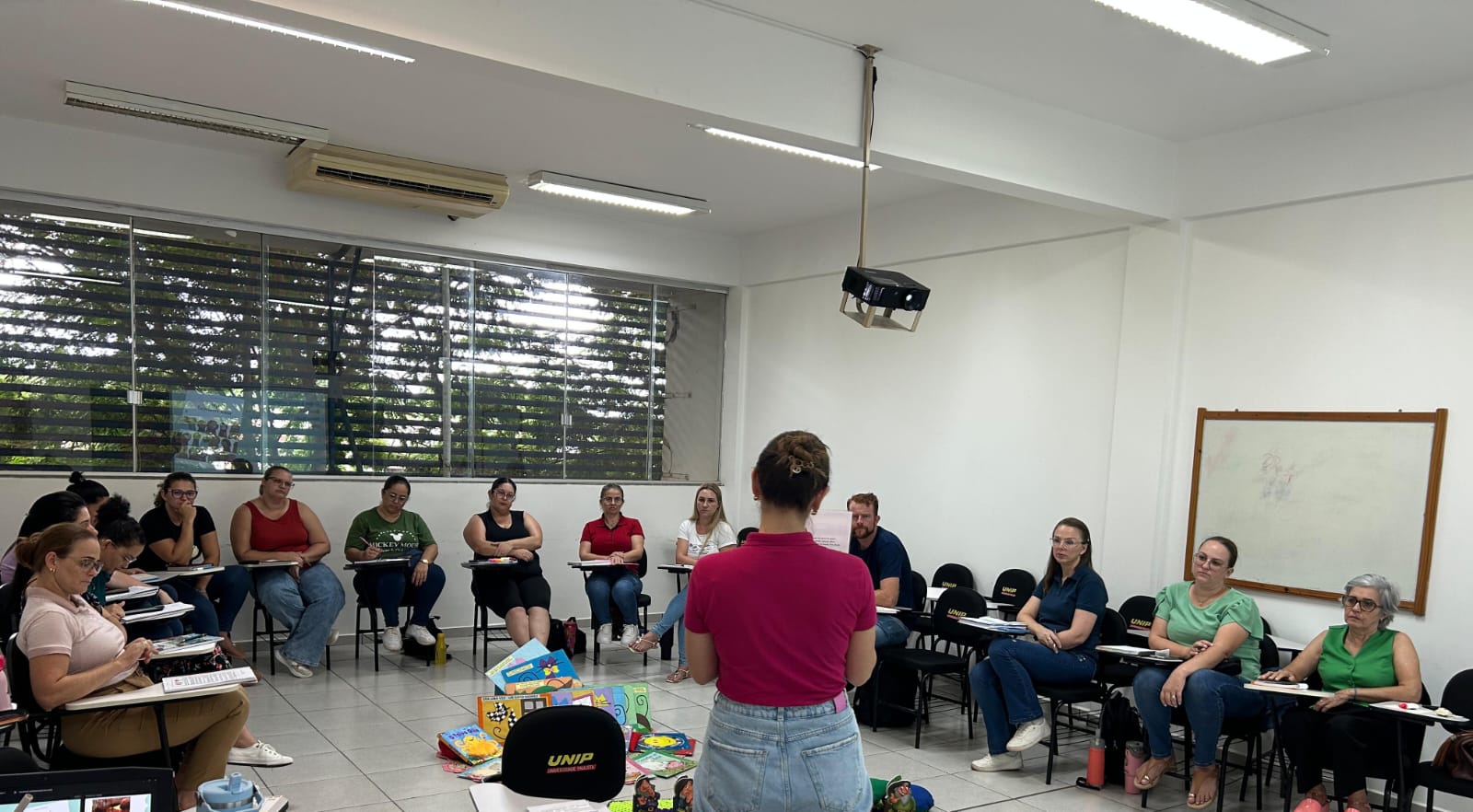 A formação foi conduzida pela formadora municipal do PROLEEI, que também atua como assessora da Educação Infantil (0 a 3 anos) e teve como foco a apresentação dos objetivos do programa, bem como o início das reflexões sobre a prática docente na Educação Infantil e o papel do professor na mediação das experiências das crianças com a linguagem, a leitura, a literatura e a cultura escrita.